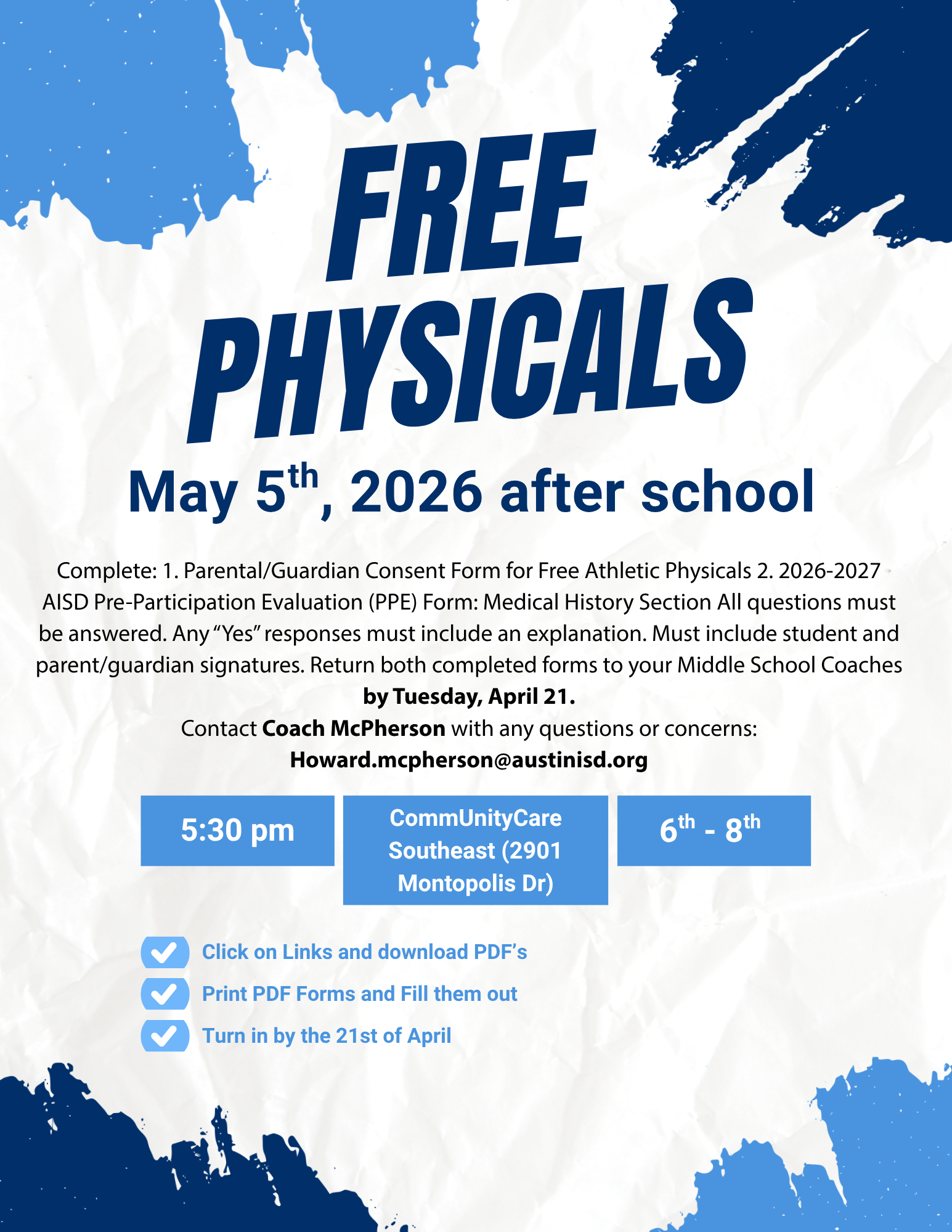 Click the links to Download, print and fill out the necessary forms for the free physicals! |
