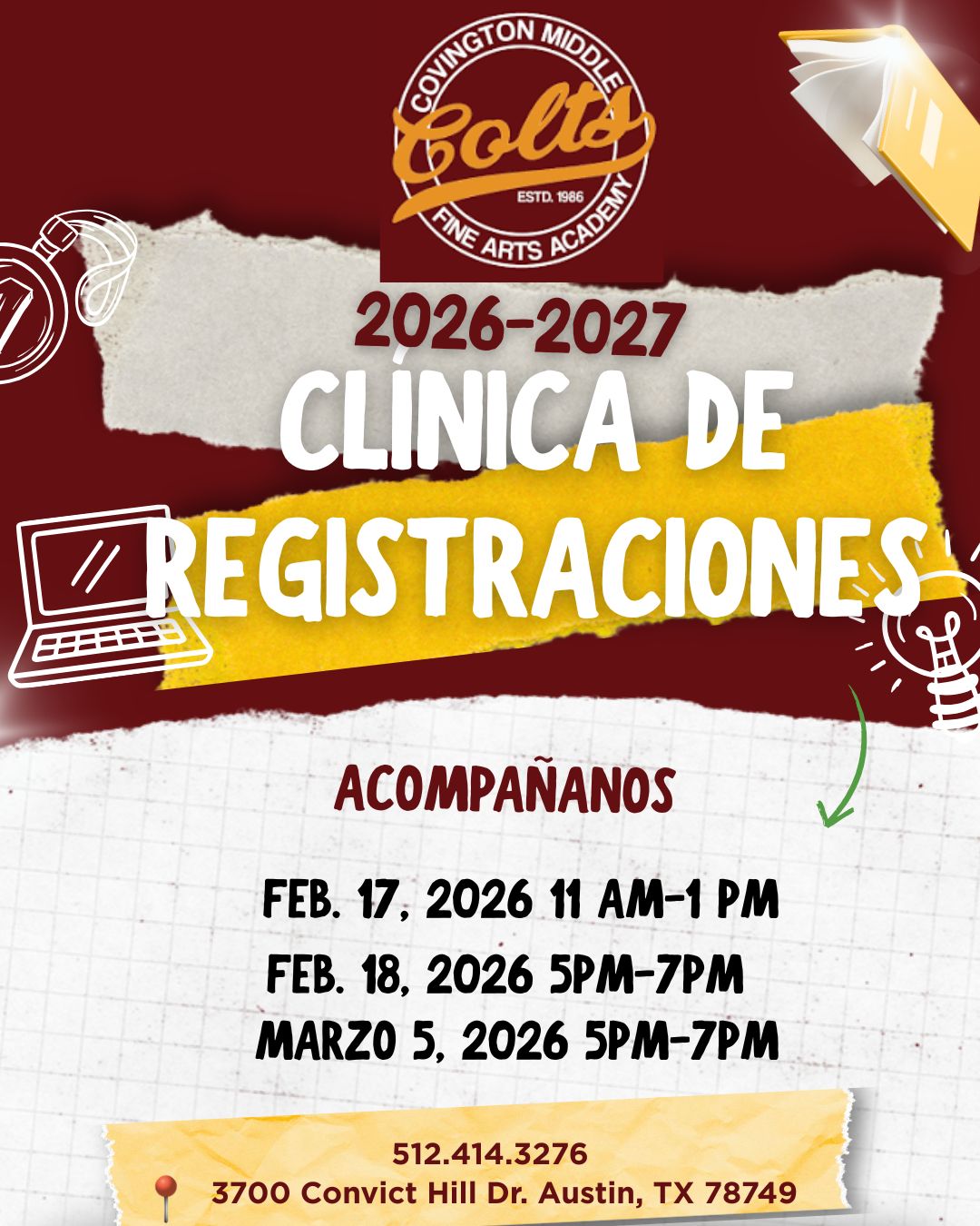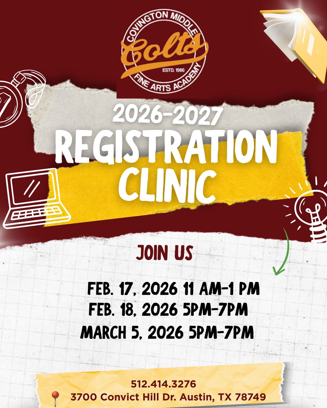 Wednesday, Feb 18th: Registration Clinic @ 5-7pm Wednesday, Feb 18th: Boys Basketball 7th/8th B Team vs Bedichek @ 6pm (Covington) Wednesday, Feb 18th: Boys Basketball 7th/8th A Team vs Bedichek @ 6pm (Crockett) Thursday, Feb 19th: TELPAS Testing (Make-up) Saturday, Feb 20th: FAA Auditions- Music & Art