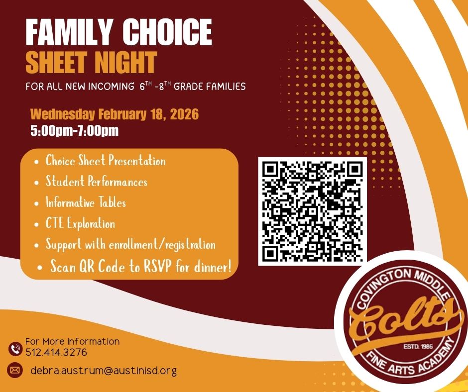 February 11 - Crockett High School Visit for 8th Grade Choice Sheets February 12 - Crockett High School Visit for 8th Grade Choice Sheets February 18 - Family Choice Sheet Night at Covington Middle School Fine Arts Academy (new to Covington students for 2026-27 school year) February 19 - Bowie High School Showcase Night