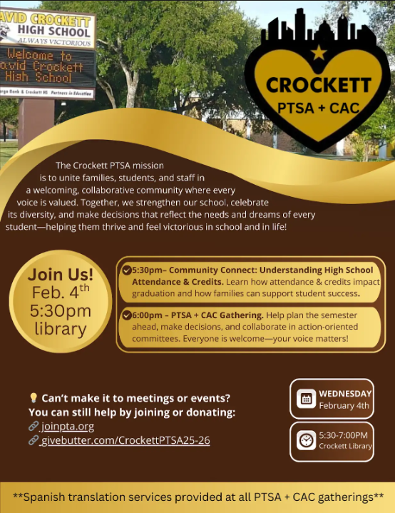 As we begin the spring semester, thank you for being part of the Crockett PTSA community! This fall, families, students, and staff came together to celebrate campus traditions, host Community Connect sessions, beautify our school, support staff appreciation, and strengthen connections across our community.