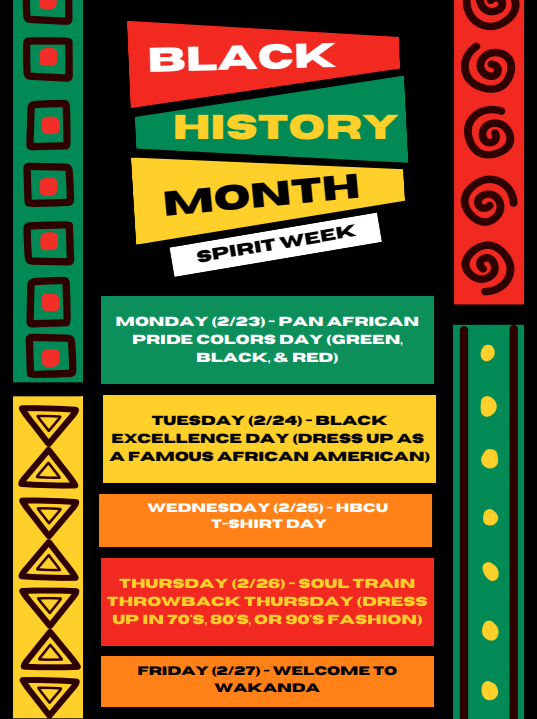 Looking ahead, we have an exciting Black History Month Spirit Week planned starting Monday, February 23rd! We encourage all our students and staff to participate in the daily themes, including Pan-African Pride Colors Day and Black Excellence Day, as we continue to honor the history and achievements of the Black community.