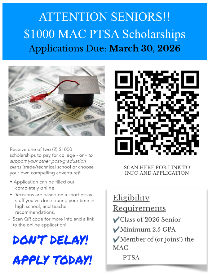The MAC PTSA Scholarship applications for the 2025-26 school year are now officially open! This is a fantastic opportunity for our students to get support for their future endeavors. Please see the MAC PTSA 2025-26 Scholarship Flyer below for more information on the application process and requirements. |
