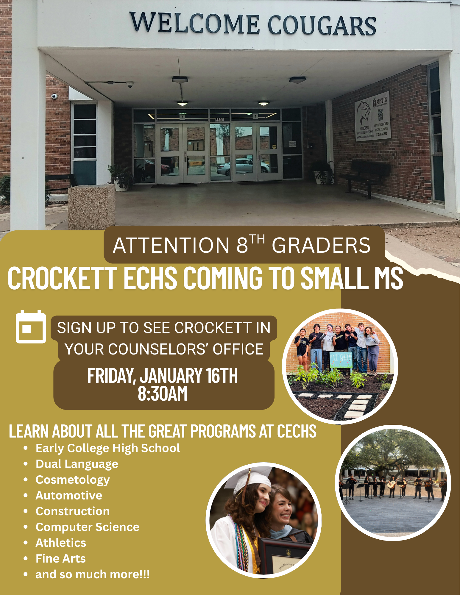 Join the discussion for academics, campus life, and insider tips for rising 9th graders and their families. Thursday, January 22, 2026 at 5:30 PM in the Clint Small Middle School Cafeteria for a special PTA meeting featuring representatives from Bowie High School and Crockett High School. We’re planning to provide refreshments and would really appreciate your RSVP so we can plan food and seating.