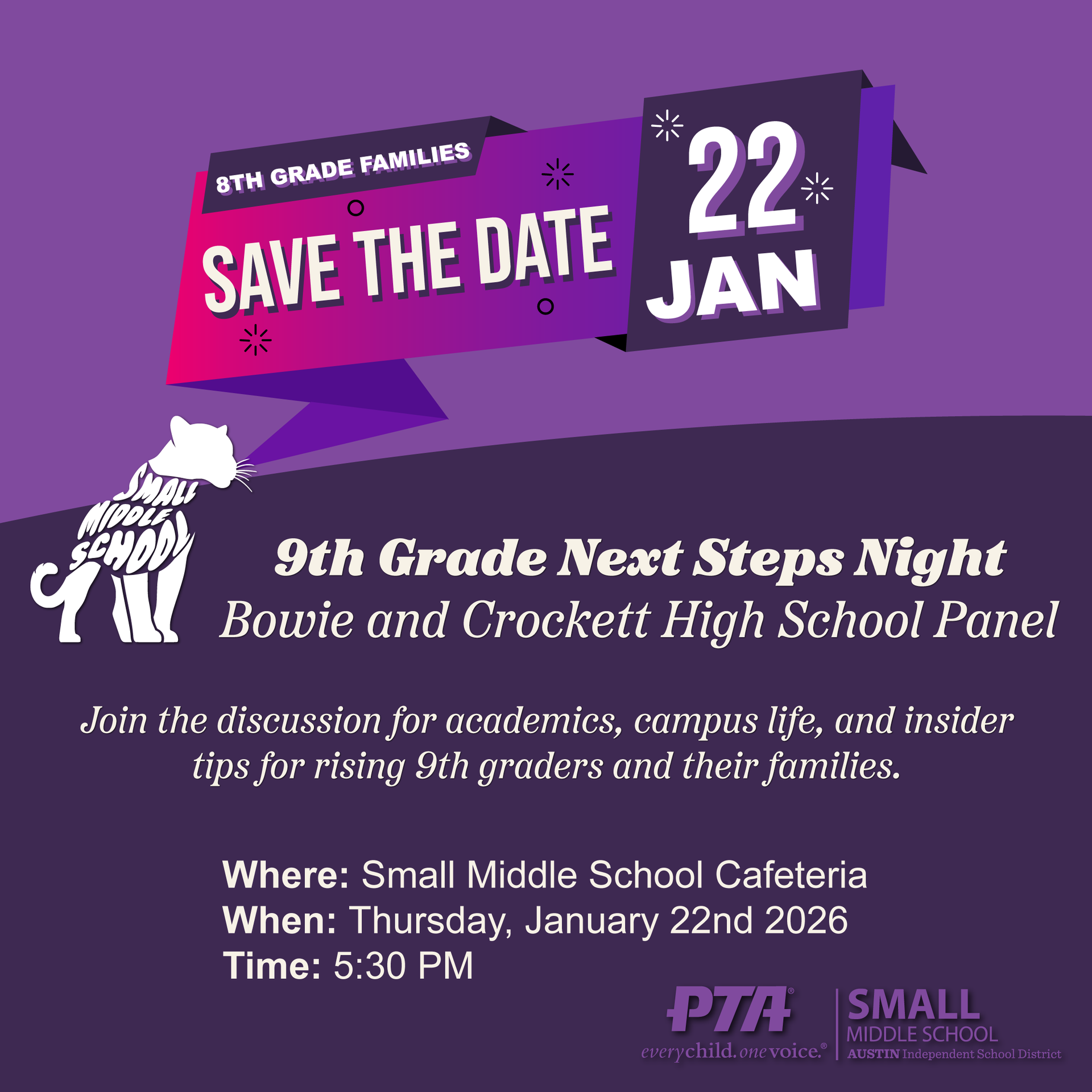 Join the discussion for academics, campus life, and insider tips for rising 9th graders and their families. Thursday, Jan 22, 2026 at 5:30 PM in the Clint Small Middle School Cafeteria. RSVP so we can plan food and seating.