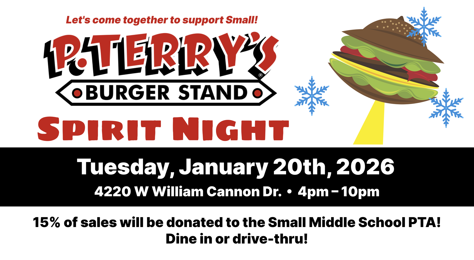 We'll see you at P. Terry's this Tuesday, Jan 20 for a night of community and fundraising! 15% of sales will be donated to Small PTA!