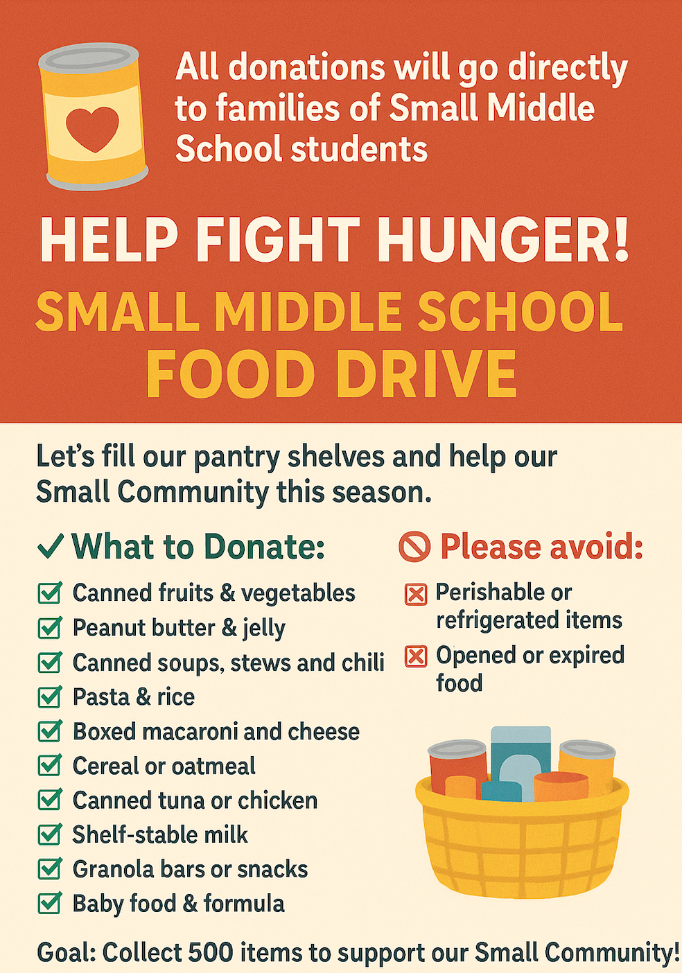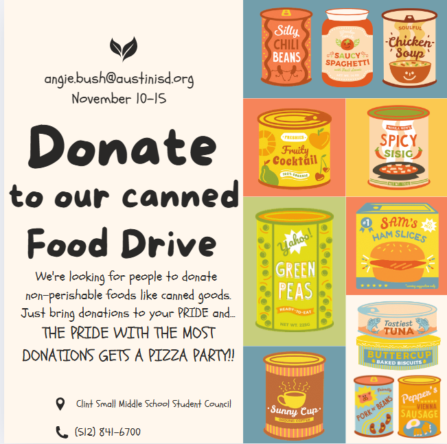 Donate to Small's Student Council Food Drive. Historically Student Council donations went to the Central Texas Food Bank, but students expressed interest in direct support for families in our community.