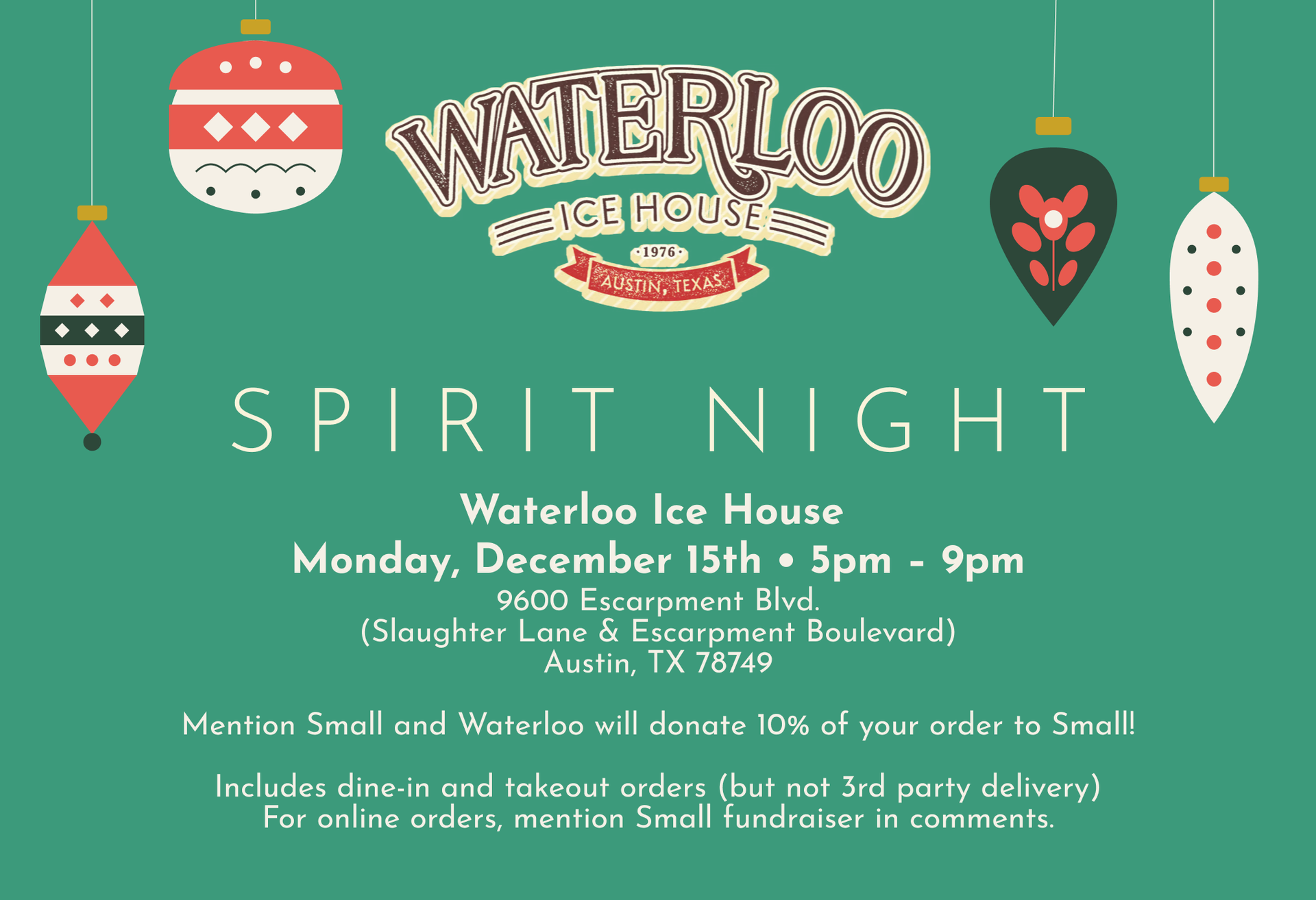 Bring the whole family out on Monday, December 15th from 5–9 PM to the Waterloo Ice House at 9600 Escarpment Blvd. Dine in or grab takeout, mention Small, and Waterloo will generously donate 10% of your order back to Small Middle School PTA to support our students and staff.