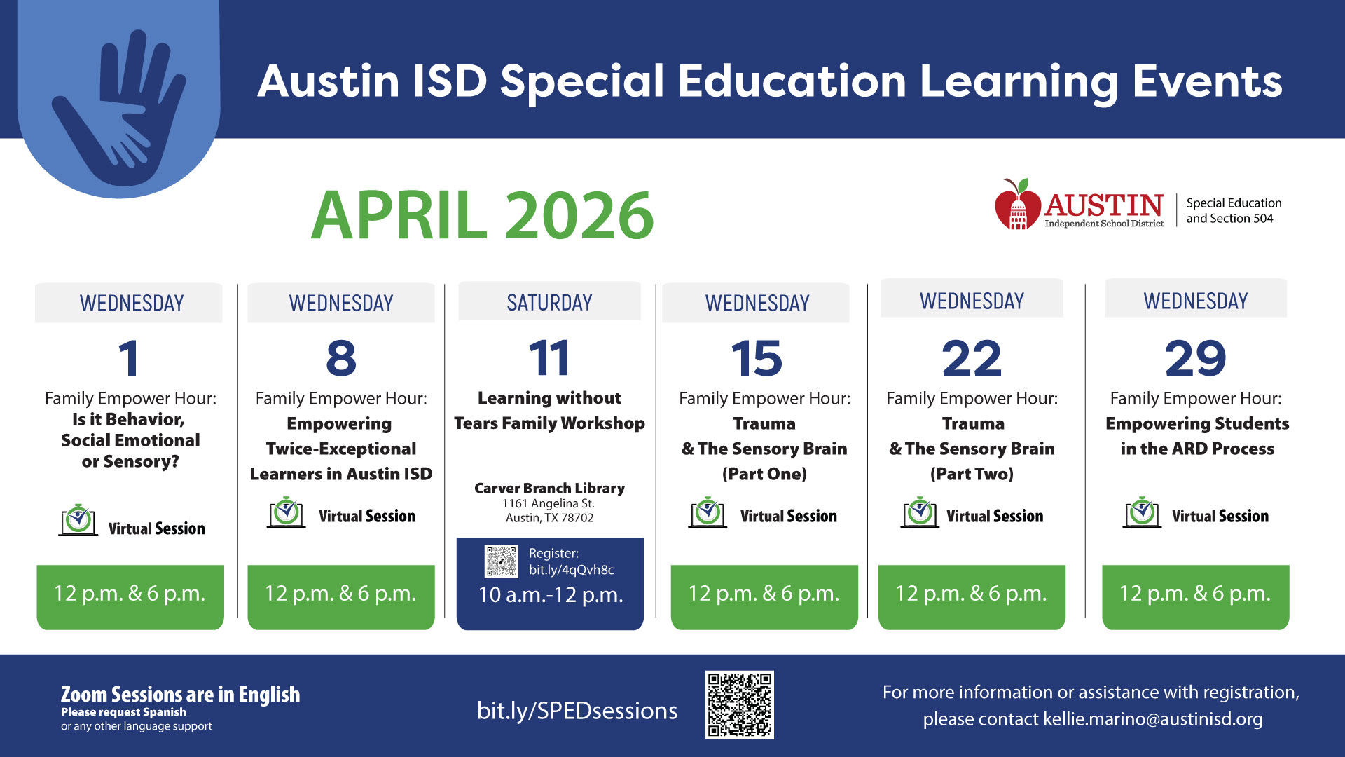 Upcoming AISD family events and workshops, including our Austin iSD Empower Hour series.