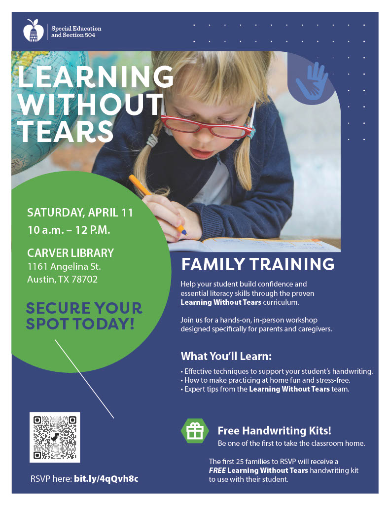 Join us for a hands-on Learning Without Tears workshop designed to help parents support their student's handwriting and literacy skills. Expert trainers will share stress-free techniques for home practice, and the first 25 families to RSVP will receive a free handwriting kit!