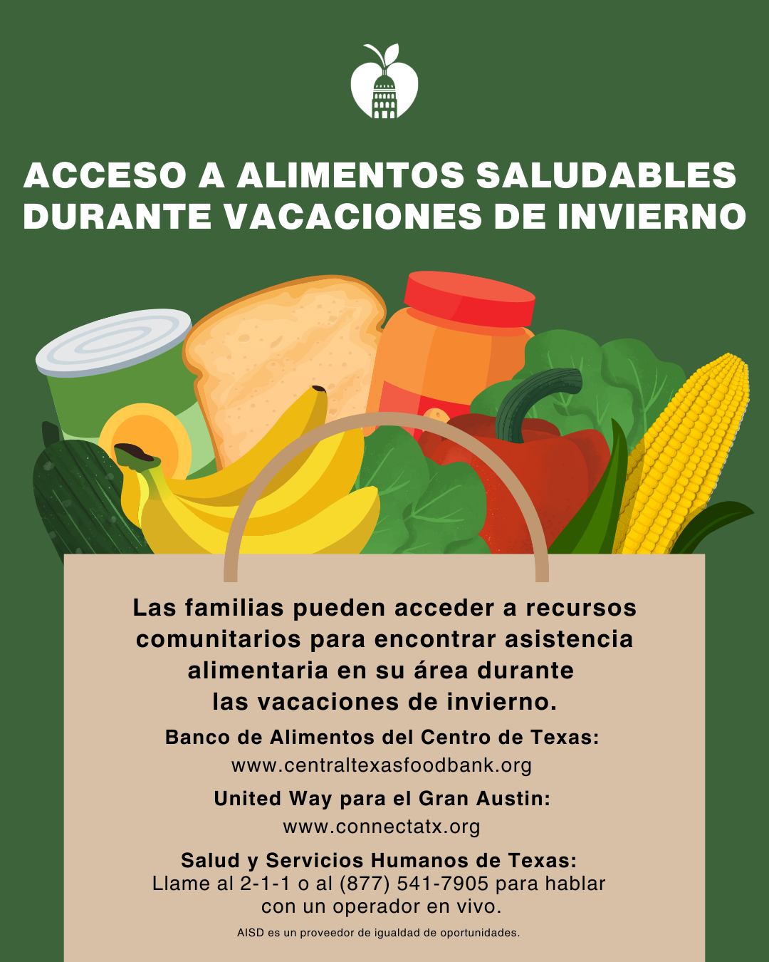 💙Las familias pueden acceder a recursos comunitarios para encontrar asistencia alimentaria en su área mientras las oficinas y escuelas de Austin ISD están cerradas por las vacaciones de invierno.