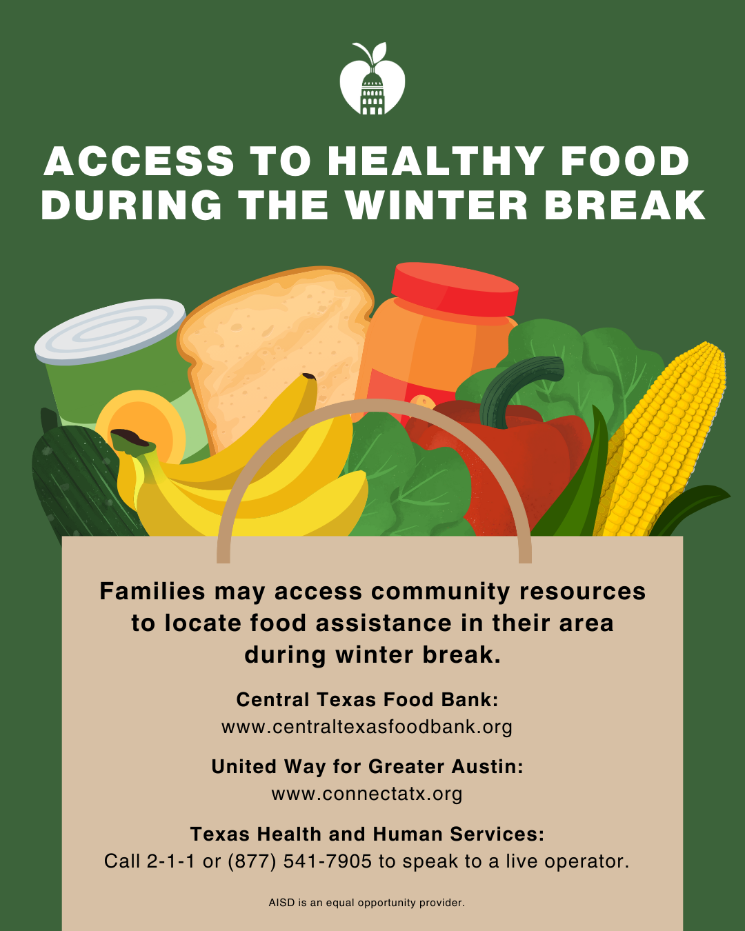 💙 Families may access community resources to locate food assistance in their area while Austin ISD offices and schools are closed for the winter break.